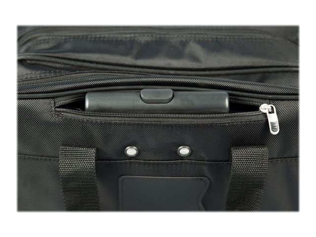 La mallette Targus Rolling Laptop Case a ete concue pour recevoir des ordinateurs portables equipes d'un ecran allant jusqu'a 16". Le rembourrage en mousse a cellules fermees protege votre ordinateur portable et le materiau en polyester 1200D durable et resistant a l'eau maintient vos affaires au sec dans les intemperies. Le poste de travail avant a fermeture eclair descendante comprend des porte-stylos, un porte-cartes de visite, une poche zippee, une pochette pour telephone portable et une grande poche pour ranger les autres accessoires. La mallette Rolling Laptop offre egalement un grand compartiment zippe pour ranger vos fournitures ou vos vetements pour les deplacements de courte de duree. La poignee telescopique se retracte dans le compartiment zippe quand elle n'est pas utilisee et la mallette est dotee d'une double poignee de transport pour plus de commodite. La Rolling Laptop Case est une mallette de voyage fonctionnelle concue pour les professionnels en deplacement.