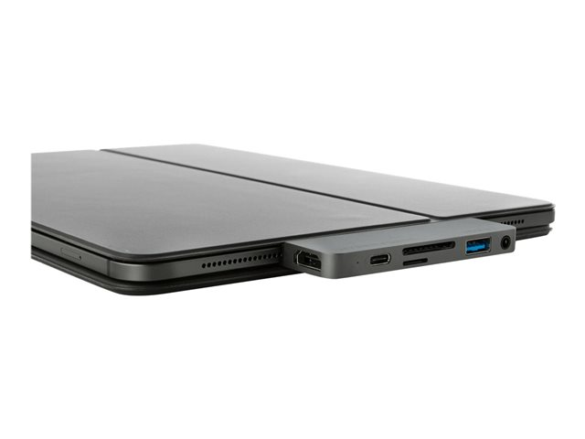 Hub USB-C de forme adaptée pour l'iPad Pro, l'iPad Air et l'iPad mini 6. Cette station d'accueil USB-C se fixe sur le côté de l'iPad en ajoutant 6 ports : Sortie HDMI 4K 60Hz, alimentation USB-C, et plus encore.