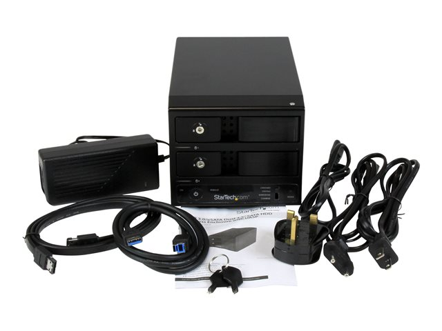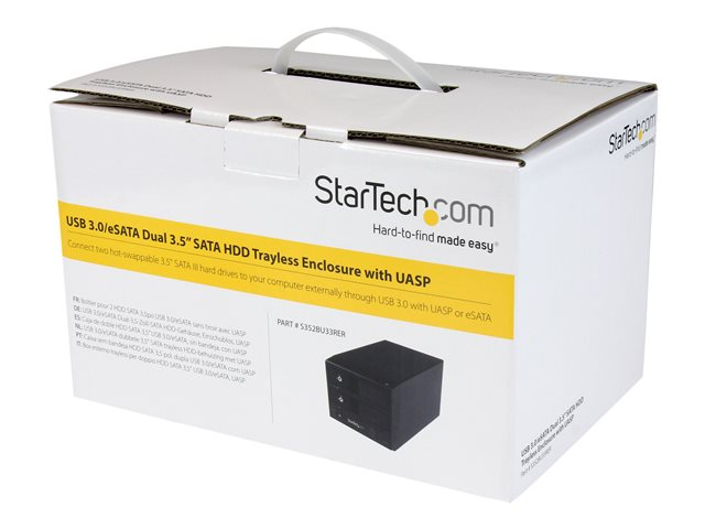 Le boîtier RAID à deux baies S352BU33RER vous permet de constituer une matrice RAID externe avec deux disques durs SATA 3,5 pouces et de la brancher à votre ordinateur par le biais d'un port USB 3.0 ou eSATA.