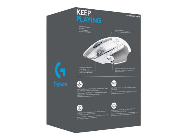 La souris G502 X LIGHTSPEED est revisitée et réinventée avec les technologies de jeu innovantes, et notamment avec les switchs hybrides LIGHTFORCE, la technologie sans fil LIGHTSPEED de qualité professionnelle, et le capteur HERO 25K. La souris G502 X LIGHTSPEED est également compatible avec POWERPLAY, pour ne jamais être à court d'énergie.