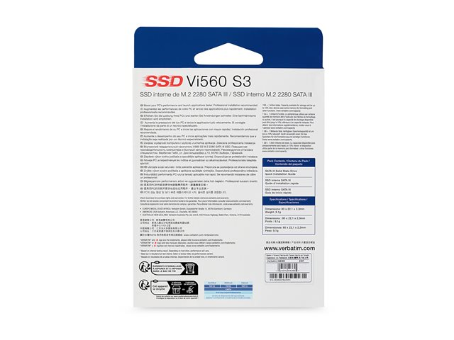 Les SSD internes Verbatim SATA III M.2 2280 peuvent revigorer les performances de votre système. Dotés de la technologie 3D NAND, ils constituent le moyen parfait pour la mise à niveau à partir d'un disque dur ou d'un disque SSD moins récent. Le disque Vi560 est doté d'un contrôleur inédit offrant une meilleure fiabilité, des capacités plus élevées et des débits en lecture/écriture plus rapides.