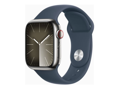 Apple Watch Series 9 (GPS + Cellular) - 41 mm - acier inoxydable argent - montre intelligente avec bande sport - fluoroélastomère - bleu orage - taille du bracelet : S/M - 64 Go - Wi-Fi, LTE, UWB, Bluetooth - 4G - 42.3 g
